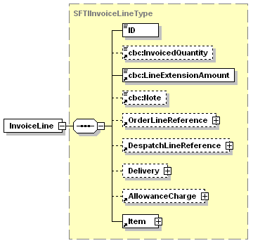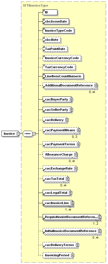 | <Invoice xmlns="urn:sfti:documents:BasicInvoice:1:0" xmlns:cac="urn:sfti:CommonAggregateComponents:1:0" xmlns:cbc="urn:oasis:names:tc:ubl:CommonBasicComponents:1:0" xmlns:ccts="urn:oasis:names:tc:ubl:CoreComponentParameters:1:0" xmlns:cur="urn:oasis:names:tc:ubl:codelist:CurrencyCode:1:0" xmlns:sdt="urn:oasis:names:tc:ubl:SpecializedDatatypes:1:0" xmlns:udt="urn:oasis:names:tc:ubl:UnspecializedDatatypes:1:0" xmlns:xsi="http://www.w3.org/2001/XMLSchema-instance"> <ID> 12345</ID> <cbc:IssueDate> 2005-08-13</cbc:IssueDate> <InvoiceTypeCode> 380</InvoiceTypeCode> <cbc:Note> Information kan anges här för hela fakturan</cbc:Note> <TaxPointDate> 2005-08-13</TaxPointDate> <InvoiceCurrencyCode> SEK</InvoiceCurrencyCode> <TaxCurrencyCode> SEK</TaxCurrencyCode> <LineItemCountNumeric> 2</LineItemCountNumeric> +<AdditionalDocumentReference> +<cac:BuyerParty> +<cac:SellerParty> +<cac:Delivery> +<cac:PaymentMeans> +<cac:PaymentTerms> +<AllowanceCharge> +<cac:ExchangeRate> +<cac:TaxTotal> +<cac:LegalTotal> +<cac:InvoiceLine> +<RequisitionistDocumentReference> +<InitialInvoiceDocumentReference> +<cac:DeliveryTerms> +<InvoicingPeriod> </Invoice> |
